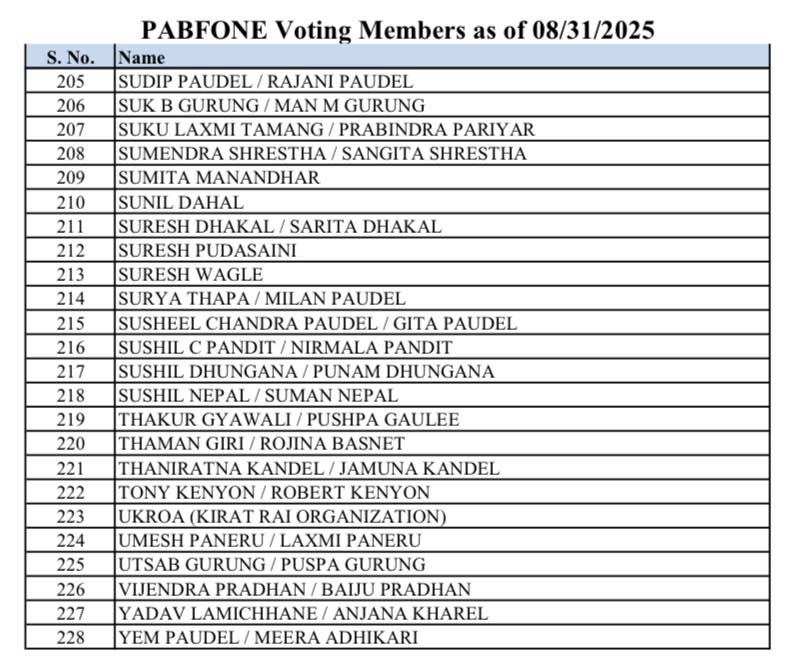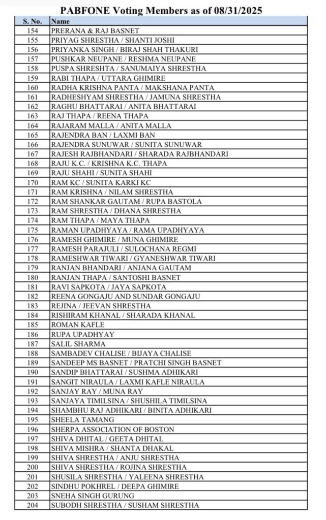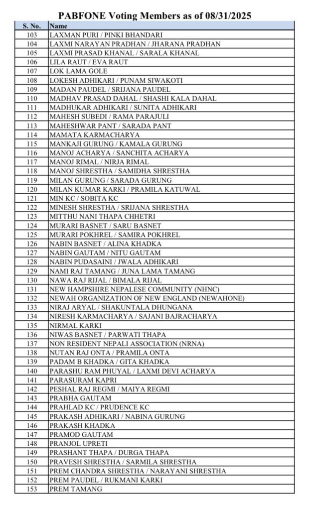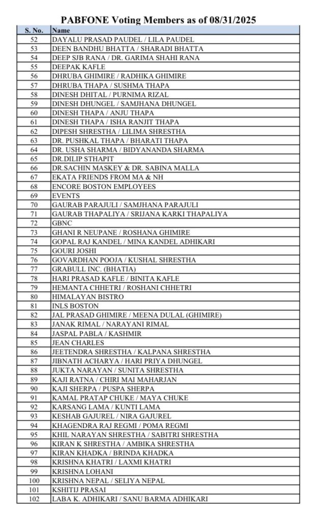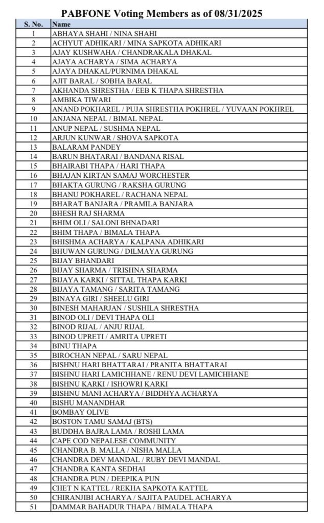 यस पशुपतिनाथ वुद फाऊण्डेशन अफ न्यू ईग्ल्याण्ड (PABFONE) बाट गठित निर्वाचन समितिद्वारा जारी अन्तिम मतदाता नामावली सम्बन्धी अत्यन्त जरूरी सूचना!!
